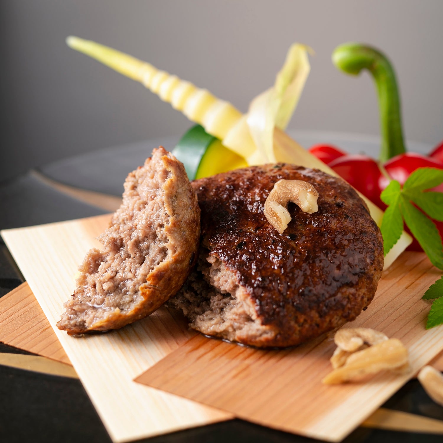 誰もが食べたことのあるハンバーグだからこそ、肉のふがねは一切妥協のない完璧な牛肉100%ハンバーグを目指しました。つなぎを極力抑え、肉の旨みと食感を存分に味わえるよう挽肉の大きさや塩分濃度にこだわり、肉のふがね独自の黄金比で造りました。